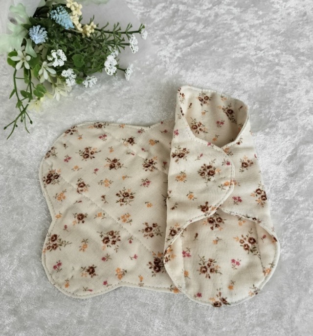 *柄の出方は異なります。 *ベージュに茶色の小花は柔らかく優しい柄。 パンティライナーを布に変えてみませんか。 体が喜び、心もほっとしますよ。 おりものシートは通気性が悪くてムレます。 デリケートな部分がかゆくなったり、 かぶれの原因になるんです。 友人が365日おりものシートを使っていたので、 プレゼントするのに作ったのが最初でした。 肌に優しく喜んでもらった事が販売のきっかけです。 僾花(ほのか)が作る布ライナーの一番と特徴はスナップボタンです。 布ナプキンの厚みがあれば気にならないスナップボタン。 でも、布ライナーは薄いので、ボタンのふくらみのポッチの気になりませんか。 その為、透明な手縫いのプラスチックボタンをお付けしています。 機械でつけるスナップボタンは簡単に付けれるけれど、 手縫いは時間がかかります。 手縫いのボタンは取れるんじゃない?とイベントで言われたこともあります。 大量生産されているシャツなどの商品はミシンのボタン付け。 なので、引っ張ると簡単に取れます。 でも、手縫いのボタン付けはしっかりボタンは包みながら付けるので、 外れる心配はありません、 痒みに敏感な方はライナーの周りを ロックミシンで処理しているものでもかぶれます。 そのため、まあるは袋縫いにしています。 布はムレません、カブレません。 中に1枚ネル生地を挟んでいるので 冷え防止にもご利用頂いています。 *おりものが気になるとき *生理が始まるころ、終わりがけ *冷え防止 両面同じ柄でお作りしています。 イベントで販売時に、裏を無地にしたものと 両方販売していたのですが、なぜか両面柄ばかり買っていく方が多く、 現在、両面同じ柄でお作りしています。 生地の在庫があるものは、裏を無地してお作りすることの可能です。 お気軽にお問合せくださいませ。 制作にお時間を2~3日頂く場合もございますので、 ご了承くださいませ。 ▶︎ 素材 肌面 綿100%(ダブルガーゼ) 吸収体 綿100%(フランネル) スナップボタン プラスチック100% ※防水シートははいっておりません。 ▶︎ サイズ 横 約16.5㎝X縦17㎝